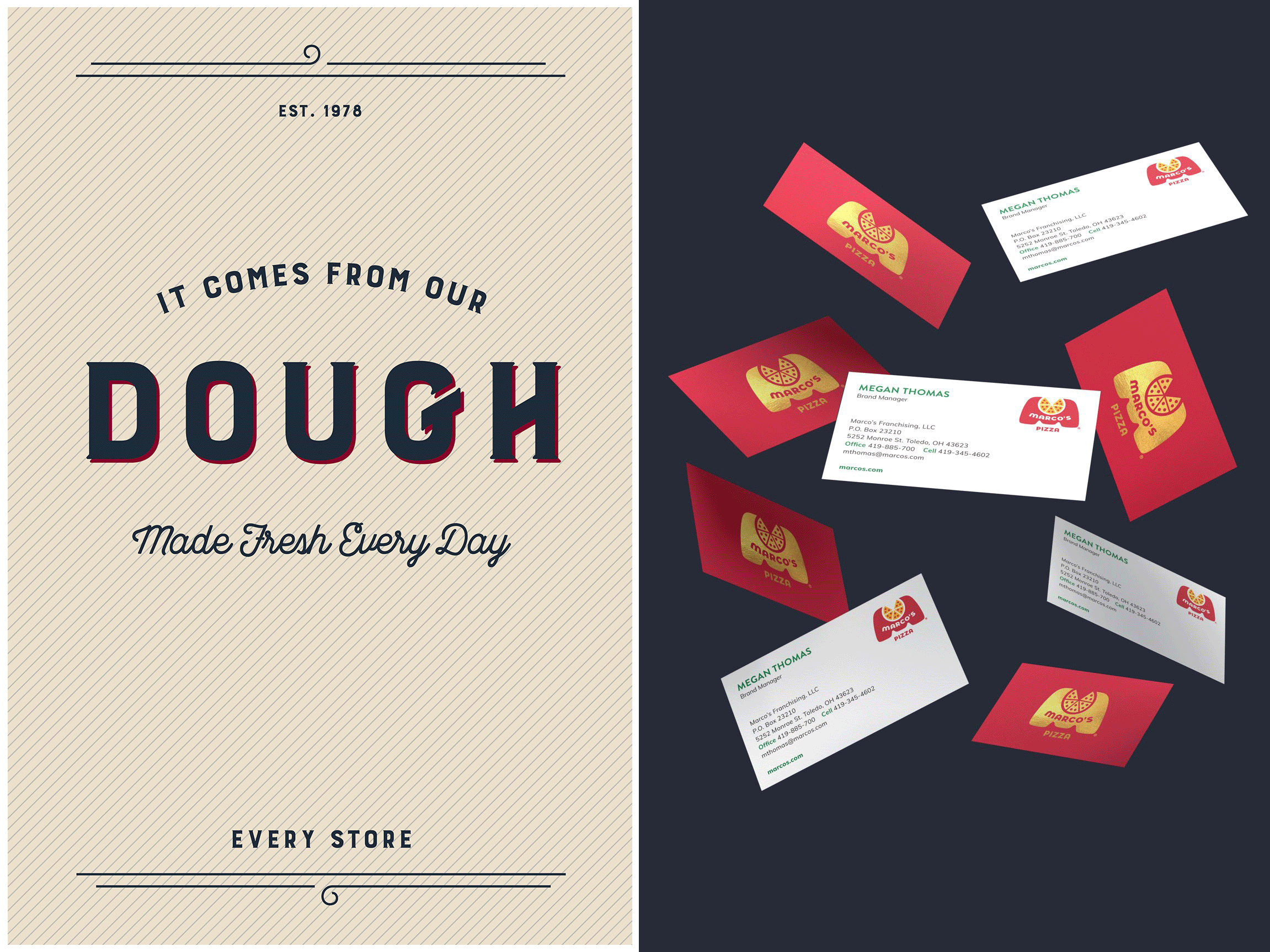 As an agency, we put everything into the pitch and became the AOR for the brand. My role from pitch through implementation was to lead the brand redesign. I directed a team of three designers through a logo refresh, a full redesign of all brand materials including menus, the pizza box, in-store packaging and decor, posters, uniforms and Marco’s gear, corporate collateral and a website redesign—bringing the brand onto solid ground to grow their business.